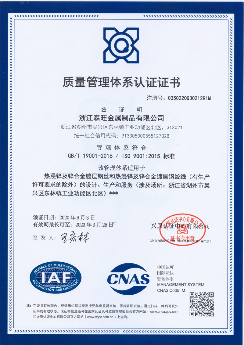 浙江森旺金屬制品有限公司成立于2012年,坐落湖州市吳興區(qū)東林鎮(zhèn)工業(yè)功能區(qū)。公司專業(yè)從事各類鍍鋅鋼絲、鋼絞線等產(chǎn)品的開(kāi)發(fā)及生產(chǎn)。目前產(chǎn)品已廣泛應(yīng)用于各類通信光電纜,電力輸送,電氣化鐵路工程,各類堤壩防護(hù)及農(nóng)業(yè)溫室等工程領(lǐng)域。公司秉承“追求卓越品質(zhì),創(chuàng)建卓著信譽(yù)”的經(jīng)營(yíng)理念,始終堅(jiān)持專業(yè)化、規(guī)?;慕?jīng)營(yíng)模式。
